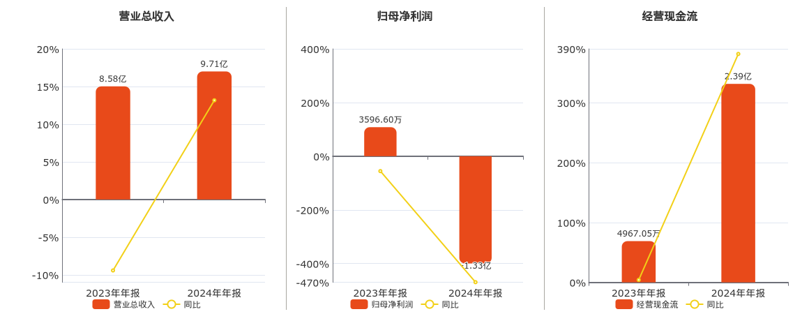 公司营业总收入为9.71亿元,在已披露的同业公司中排名第8。归母净利润为-1.33亿元亿融策略,在已披露的同业公司中排名第6,较去年同报告期归母净利润减少1.69亿元,同比较去年同期下降469.37%。经营活动现金净流入为2.39亿元,在已披露的同业公司中排名第6。