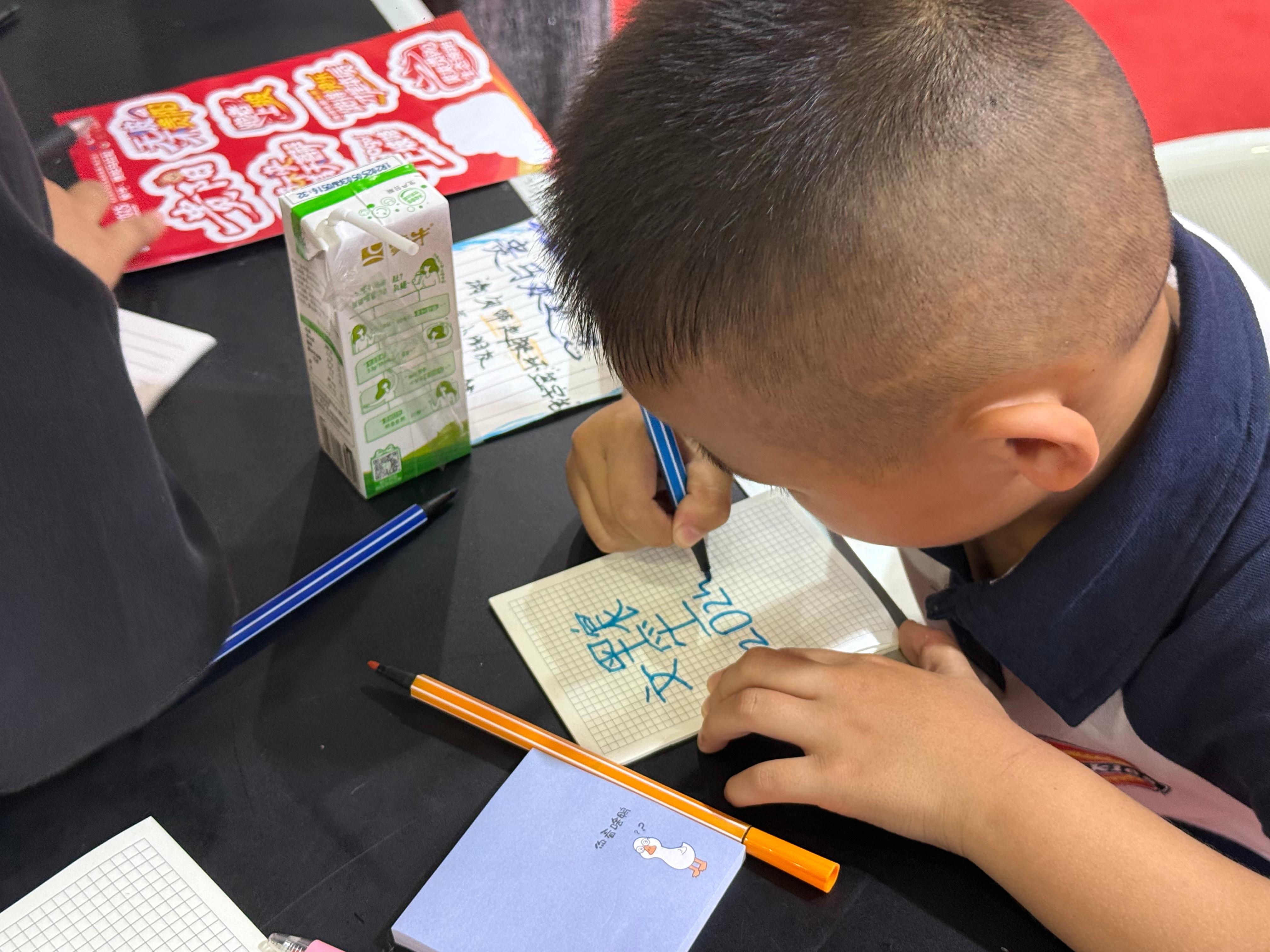 6月14日,开赛前一天,在赛事领物现场,文墨宸趴在心愿墙的桌子前,一笔一划认真地写下自己的名字。稚嫩的字迹旁,藏着一个小小的心愿:“跑完5.2公里!”而这次,他做到了!