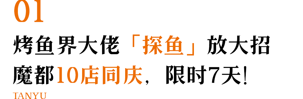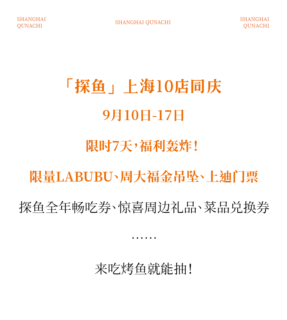 为了庆祝魔都烤鱼界这场“城中热事”,9月10日-17日,连续7天的限时狂欢,上海10家门店同步开嗨!