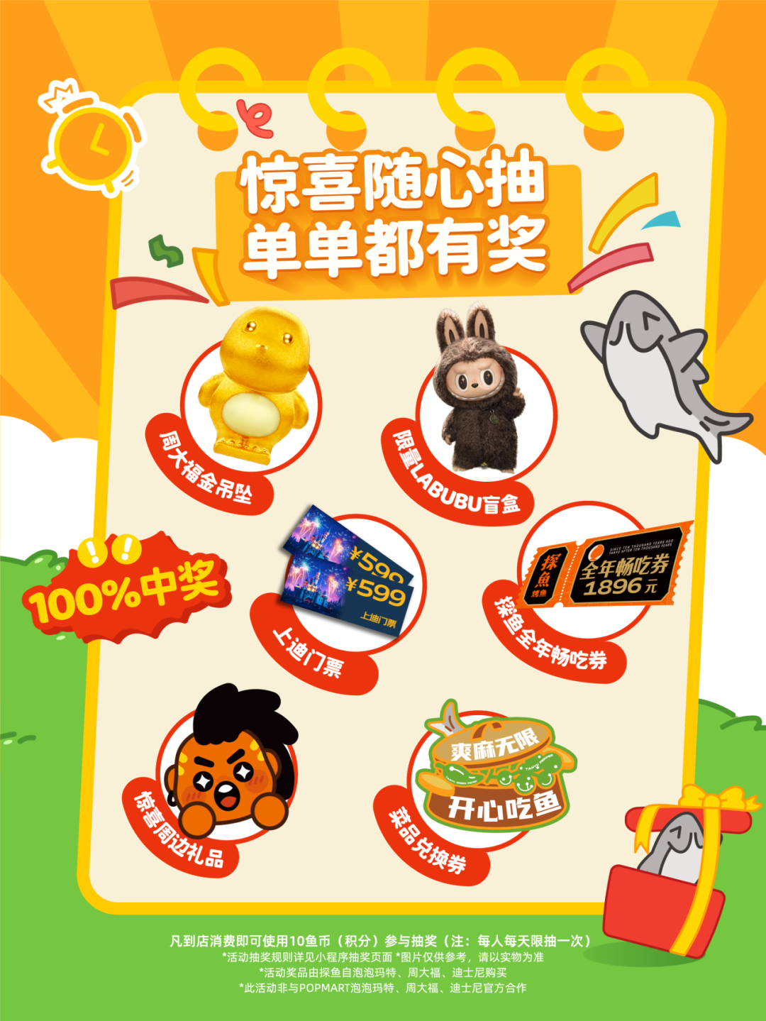 一秒拿捏住吃货的,还属奖品里的“探鱼烤鱼全年畅吃券”。每个月来吃一次烤鱼,能吃上一整年,最近来还能吃到魔都的限定新口味!「探鱼」一出手,就要为你实现烤鱼自由~