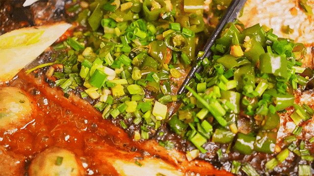 一根大葱横在锅上,鲜葱与青椒切段铺满鱼身,霸气造型还没上桌就吸引住眼球!青花椒、藤椒带来爽麻,在高温下与红葱油碰撞出绵绵不绝的葱香与焦香,引得人食指大动!