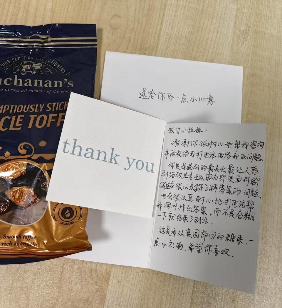 两天后,王女士再次来到网点,对小郭专业、负责、耐心的服务,表示赞赏和由衷感谢,并向她赠送了感谢卡片,卡片上字字句句满是感激之情,“你是我遇到的最专业,最让人感到细致且专业的。因为即使面对客户(我)的很小众、你不了解答案的问题,也会很认真耐心地打电话帮我找出答案,而不是含糊一下就结束了对话。”