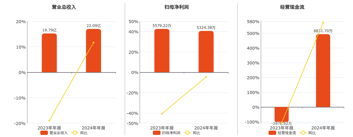 公司营业总收入为22.09亿元。归母净利润为5324.38万元,在已披露的同业公司中排名第32,较去年同报告期归母净利润减少254.84万元,同比较去年同期下降4.57%。经营活动现金净流入为8831.70万元,在已披露的同业公司中排名第29。