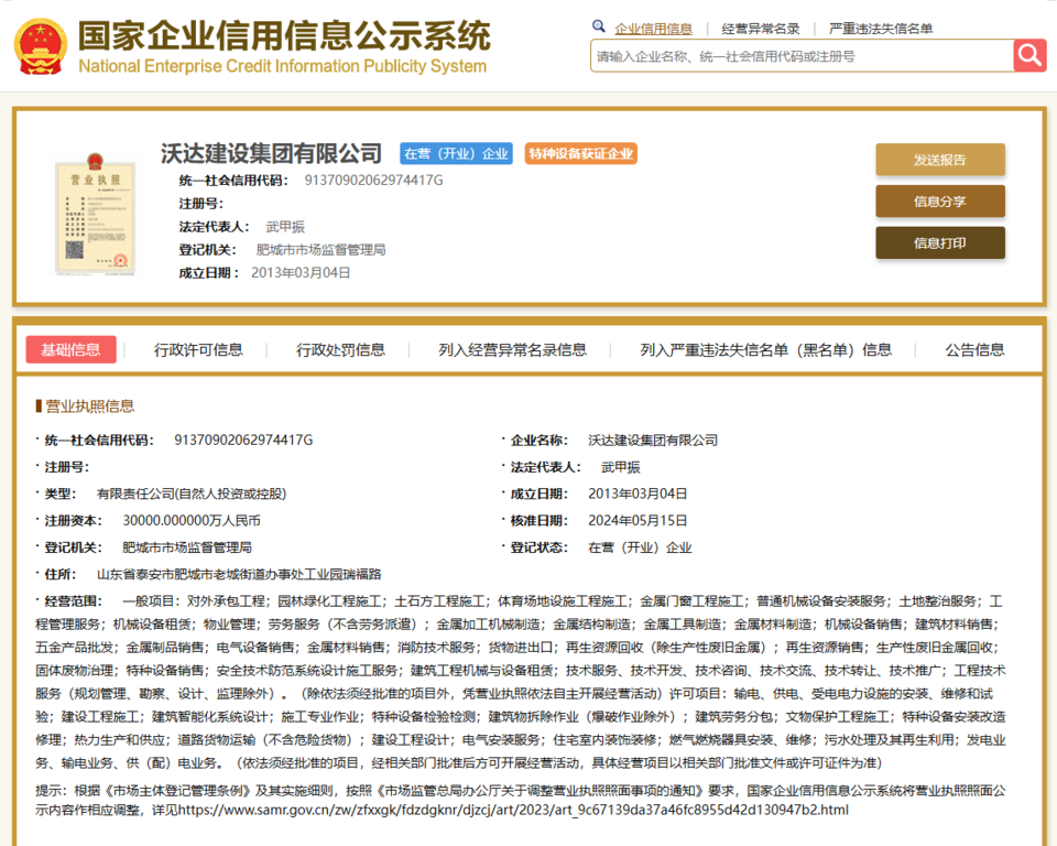 该公司官网显示,沃达建设集团有限公司始建于2013年,注册资金3亿元,公司总部位于山东省肥城市。公司与国家电网、国家电投、中石油、中石化、华电集团、华能集团、五矿集团、中国交建、中国能建、中国建筑、中国铁建、中国化建、北京城建、北京建工等业主建立了良好的合作关系。